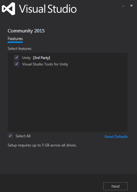 Click Install to continue the installation of Unity and the Visual Studio Tools for Unity.