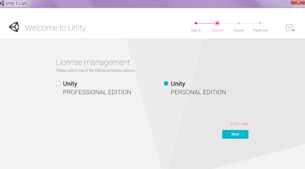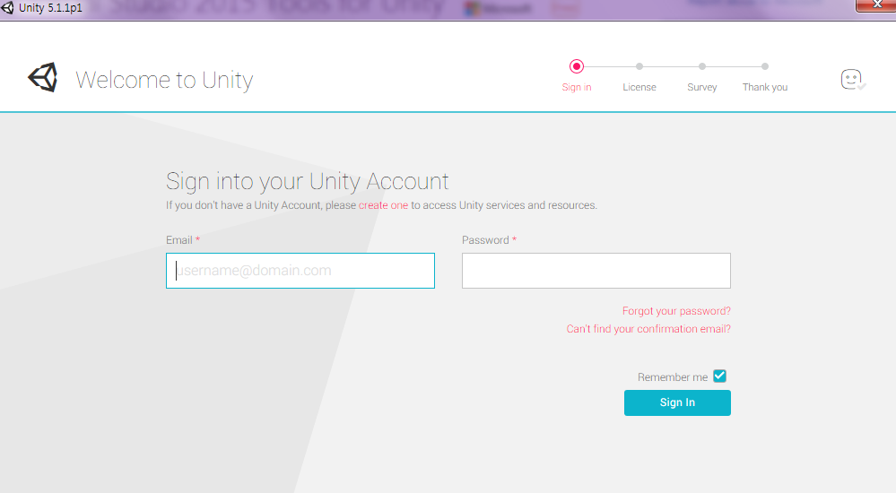 When you click Unity from the Start menu for the first time, it will ask you to sign in using your Unity account. If you don't have the Unity Account you can create a new unity account and use the account login to open your Unity framework.