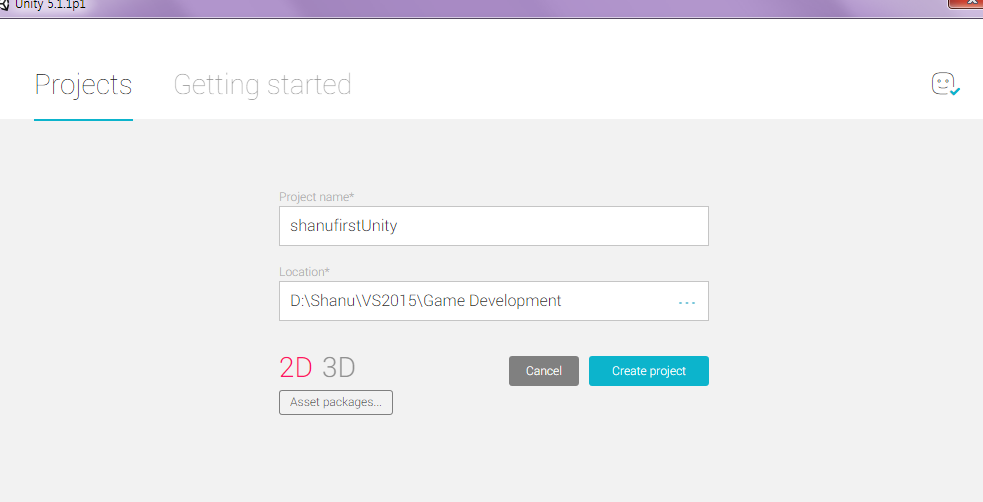 Select your project folder and provide your Unity application name and select 2D or 3D. In this example I used Unity 3D so I selected 3D and clicked Create project.