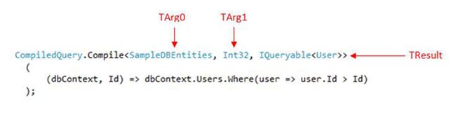 By comparing the code above with the overload definitions of the Compile method (previous image), we can see that we have TArg0 as our object context of entities, TArg1 is a filter condition and TResult is the output of the query or List of the Users, in our example. Like TArg0 and TArg1, we can have up to TArg15 as input parameters in the query.
