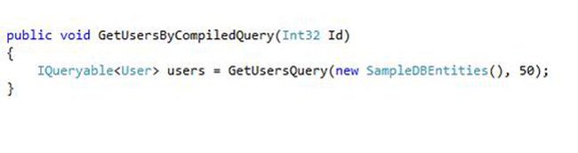 This is it. Now we just need to create a method in order to call this query multiple times. In our case we will add a method named GetUsersByCompiledQuery. This will invoke our delegate, that will further execute the Compile method.