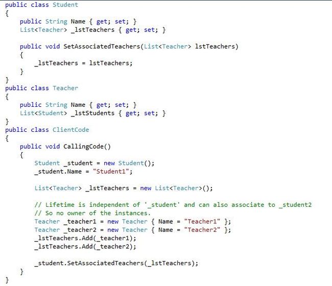 - Secondly, any other student instance, say _student2, can also have the same instances of teacher, in other words "_teacher1" and "_teacher2" associated with it. So we can also say that no instance of student is a parent of any instance of teacher. So there is no ownership of instances in the association.