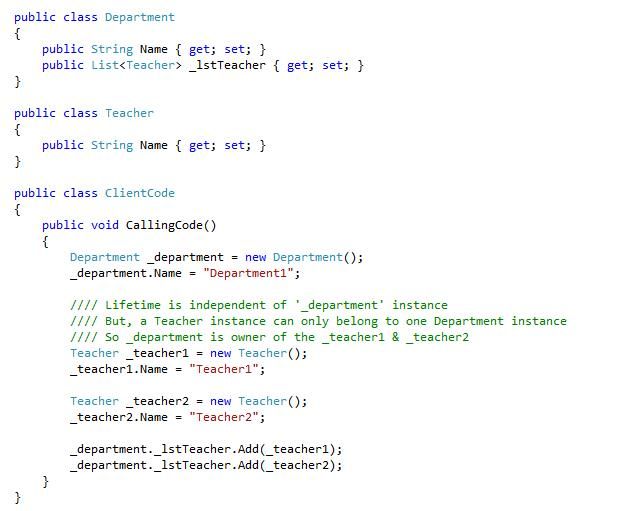 - First, the lifetime of "_teacher1" and "_teacher2" instances are independent of the lifetime of a "_department1" instance, since they are instantiated outside the department class. So even if a "_department1" instance is disposed if, "_teacher1" and "_teacher2" instances may continue to exist.