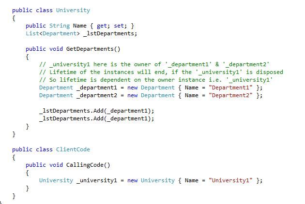 - Secondly, here the lifetime of department instances are dependent on the instances of university, since they are being created inside the university class. So when the "_university1" instance is disposed of the "_department1" and "_department2" instances are also killed. This is the composition concept.