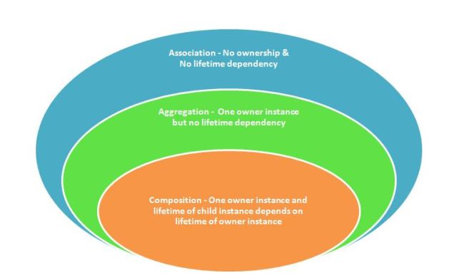 So if we closely observe the concepts of Association, Aggregation and Composition, we can say that composition is a subset of association and aggregation and aggregation is a subset of association. In other wors, Association is a super-set of aggregation and composition can be represented as: