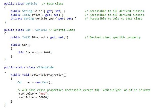For example: we have a base class named Vehicle and a derived class named Car, from the base class. So Car will have access to all the functions, properties and so on of the base class Vehicle (depending on the access modifiers defined for base class members). See the code below: