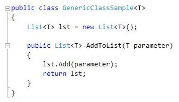 Here, we have created a method that takes an input parameter of type T that can be of any type that can be specified when we use this class and adds it to a list that is also of type T. Finally this list is returned by the function created.