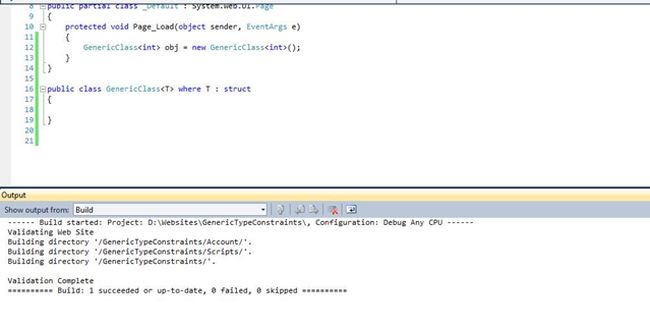 So, we have a generic class with generic parameter type T and we apply the constraint on it with the type parameter T, that is being used with the generic class that must be of value type, since we have restricted the use of this class with a struct type only, by adding the where keyword. See the code below: