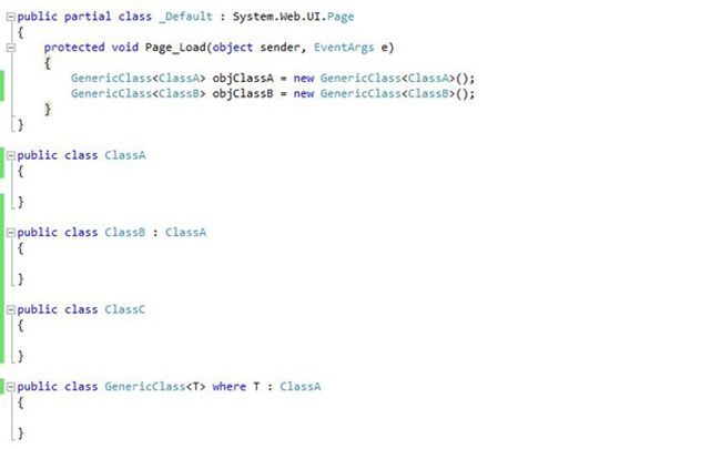 So here, we can have the type parameter T to be of type ClassA or ClassB, but not ClassC. This is because the where keyword specifies that the type parameter should be either ClassA or any derived class from ClassA, in other words ClassB is also valid. But not ClassC, since it is independent.