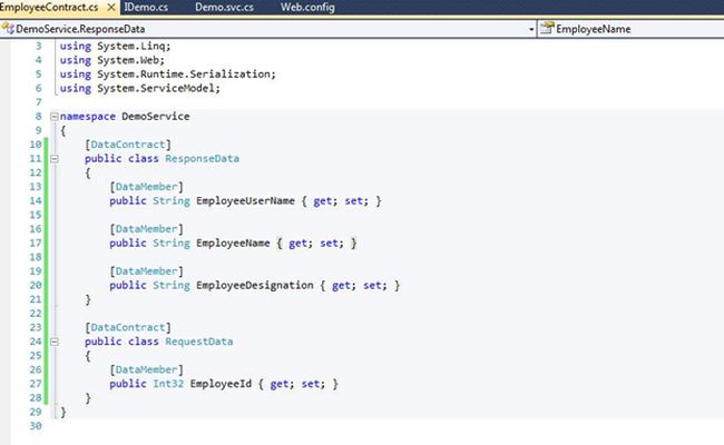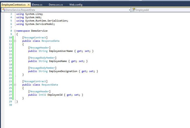 Add a new WCF application and add 2 classes named RequestData and ResponseData. RequestData has a property named EmployeeId and ResponseData has properties representing the details about the Id being sent by the client. In order to serialize this data and transfer it using SOAP, we will only add DataContract and DataMember attributes to these classes and there properties respectively.