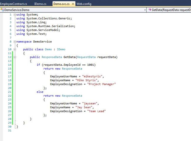 Next, we will add a method in our service interface, that will take an input of type RequestData and return output of type ResponseData. Depending on the EmployeeId received in the request, it will return data of the user. So our implementation will be like the following: