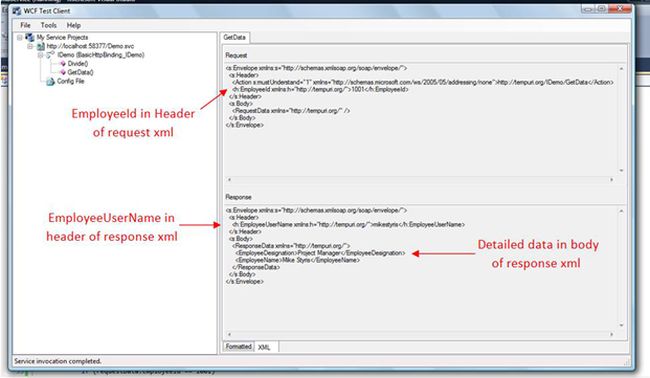 Now, run the WCF test client, set a sample EmployeeId and invoke the method to see the results. We can see that the request and response SOAP XMLs contain the EmployeeId that we had set and its corresponding details respectively.