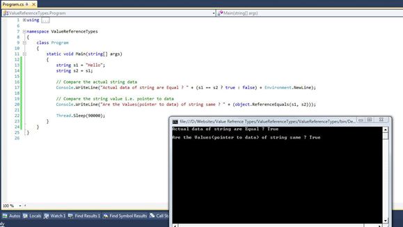 Let's use an example to analyze this behavior. For this, we will simply create one string and assign it to another string. Then we will compare the values (that are references to the actual data in this case) of both and the actual data they point to. So we write the following code and run the application.