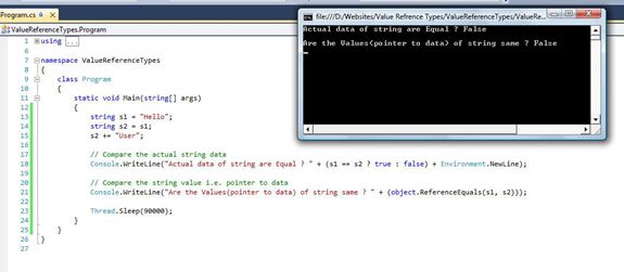 Now in the next step, we only change the s2 to append a string value to it. This time, of course the data is changed. But in this case, the value (pointer to actual data) of s2, is modified to point to the newly generated string. Had it modified the existing string, in other words Hello, being reference types, the value of s1 would have also changed to Hello User and the comparison of values of s1 and s2 would have returned true. But this did not happen, since changing the value of s2 resulted in the creation of a new string, pointing to the new data. So not only the values differ, but also the pointer (reference to the data) becomed different. So the comparison of the data and the references these strings hold, returns false.