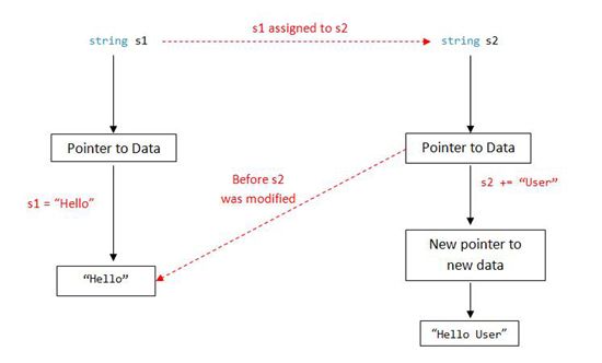 - Being a reference types implies, that the value of a string variable is NOT the actual data, but a pointer/reference to the actual data.