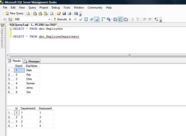 Normal Sub-query: In this type of query, the outer or parent query and the inner query are independent of each other when executing. In this, the inner query is executed first and then the result set returned by this query is used by the outer query to generate the final result set. Let's write a sub-query with the data setup we created above. This will provide us with all the employees, that has a record in the EmployeeDepartment table. So our query is like the following, with the results.