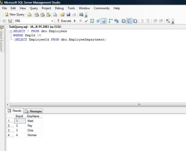 First it selects all the records in the EmployeeDepartment table, that returns all the EmployeeId's in the table (4 records). Then, using the IN operator, the outer query gets all the records from the Employees table with an EmployeeId in the result set returned by the inner query, to return only the matching records. So the result is the output that we see above.