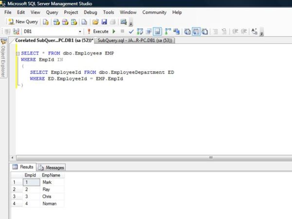Co-related sub-query: In this type of query, the two queries, in other words the outer and the inner query, are dependent or linked to each other, to generate the final result set. Now, let's use the co-related sub-query to get the same results and then we will discuss how they are linked and how it works. Our query changes to the following and we can see the results accordingly.