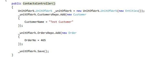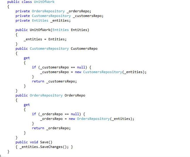 Let us implement this concept in our example. We add a new class called UnitOfWork and this class will receive the instance of the DbContext. The same class will further generate the required repository instances, in other words repository instances for Order and Customer and pass the same DbContext to both the repositories. So our UnitOfWork will be like the following: