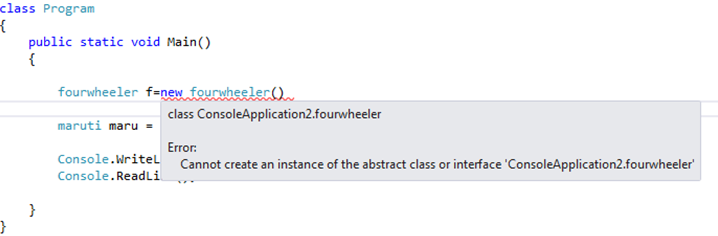 Now I will explain with an example. Here I declaed an astract class named fourwheeler containing a method explain(). And a class called maruti derived from the abstract class and I created an object of the derived class inside a main() function and call the abstract class's methods.