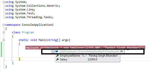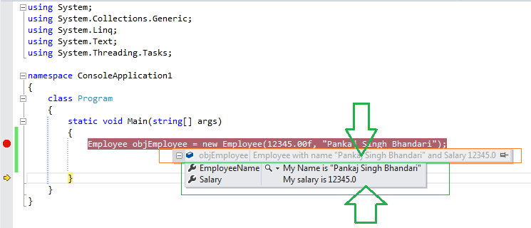 - [DebuggerDisplay("Employee with name {EmployeeName} and Salary {Salary}")]