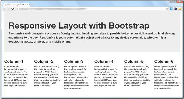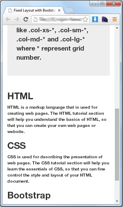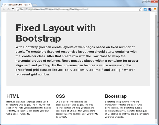 Creating Fixed Layout with BootstrapWith Bootstrap you can create layouts of web pages based on a fixed number of pixels. To create the fixed yet responsive layout you should start the container with the .container class. Then create the row with the .row class to wrap the horizontal groups of columns. Rows must be placed within a container for proper alignment and padding. Further columns can be created within rows using the predefined grid classes like .col-xs-*, .col-sm-*, .col-md-* and .col-lg-* where * represents a grid number.