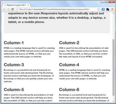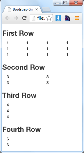 In the HTML above you can see the use of 6 columns for larger devices like desktops, 3 columns for medium devices like laptops, 2 columns for small devices like tablets and 1 columns for extra small devices like phones. For clarity the float property from .col-* classes we can used the .clearfix class depending on conditions using the .visible-* class.
