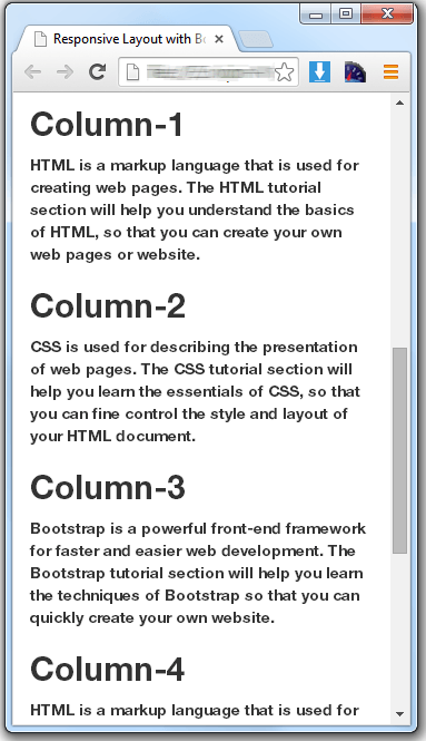 Now we have customized our layout for extra small devices. For extra small devices we use the .col-xs-* class. In a tablet and a desktop device we have a total of 21 columns. Now we break the grid system as: