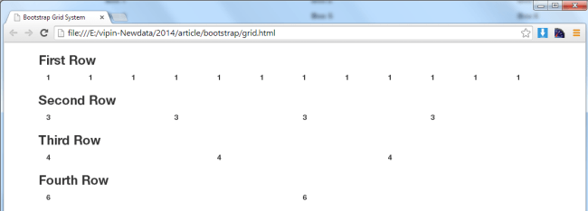 In the preceding image there are 4 rows. The first row contains 12 columns. The second row contains 4 columns. The third row contains 3 columns. And the last row contains 2 columns. Now we create a HTML file for the above grid image structure.