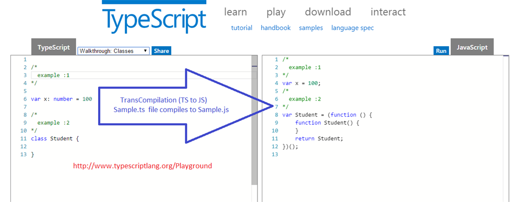 You can test how TypeScript works at the Microsoft official TypeScript site. Microsoft has given a quick editor where you can type in valid TypeScript and on the right side you can see the JavaScript generated. It's a neat tool to understand the power of TypeScript. You can check it here.