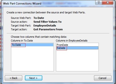 Step 9: In the next dialog select Target Web Part (if multiple Web Parts are added to the page) and change the target action to “Get parameters from” and click "Next".