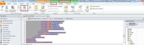 Step 4: After opening the List Web Part in SharePoint Designer, click anywhere on the List Web Part to select it, then in the ribbon click on the list view tools select "Options" then the Parameters icon.