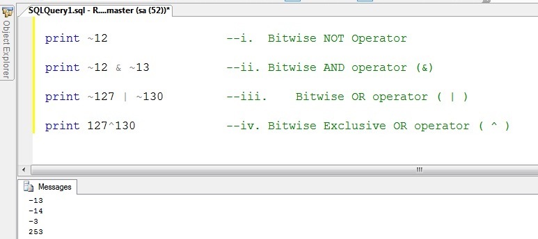 Our computer language by default works with bit values 0 and 1. We see here some binary operations with SQL. How do they work? Bit operations work with the ~ symbol.