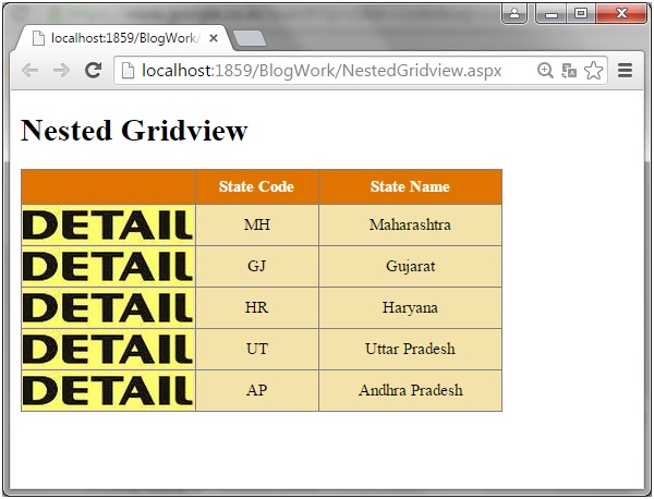 Now for the first State data fill in the parent GridView with the page load and Chid grid data is obtained in the parent GridView RowDataBound event as in the following code: