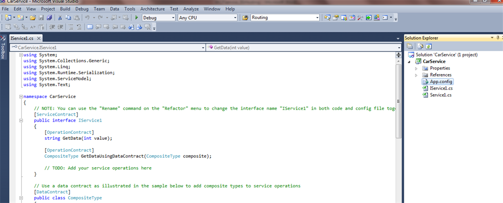As you can see we are using wsHttpBinding. The Service name is <service name="CarService.ProductService"> Contract is contract="CarService.IProduct">,