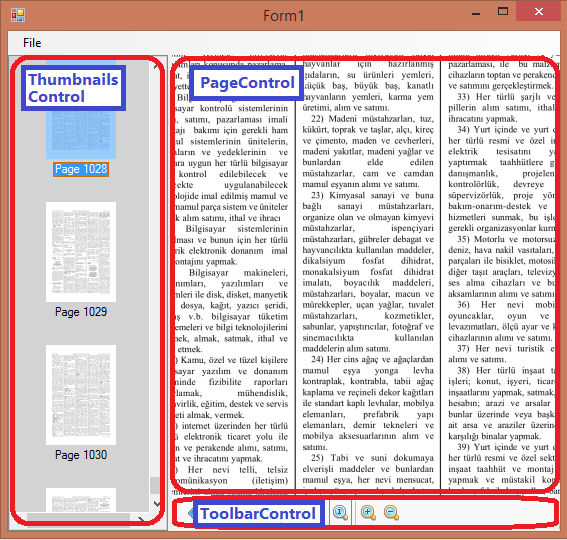 The ToolbarControl has a ToolStrip control which contains buttons to zoom in/zoom out the image, select the page of TIFF file to display.