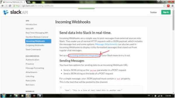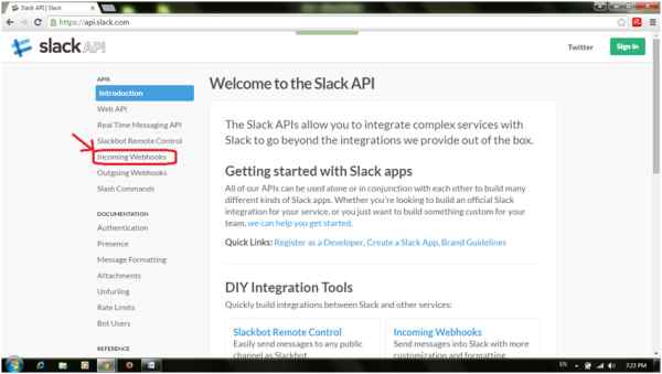 - Go to the following URL and click on the Incoming Webhooks link api.slack.com as shown in the figure.