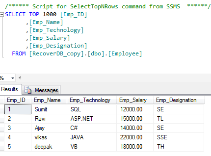 I have created a database named RecoverDB and a table named Employee and Personal_Detail. Now I will insert a few records in the table.
