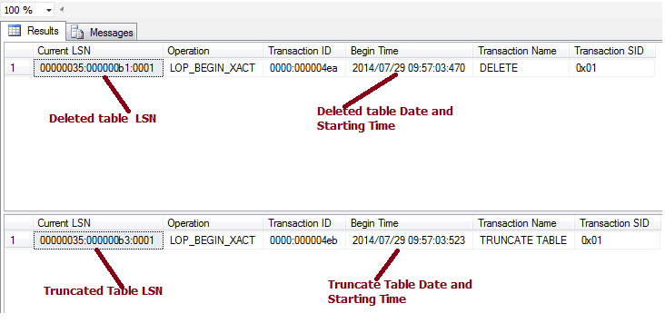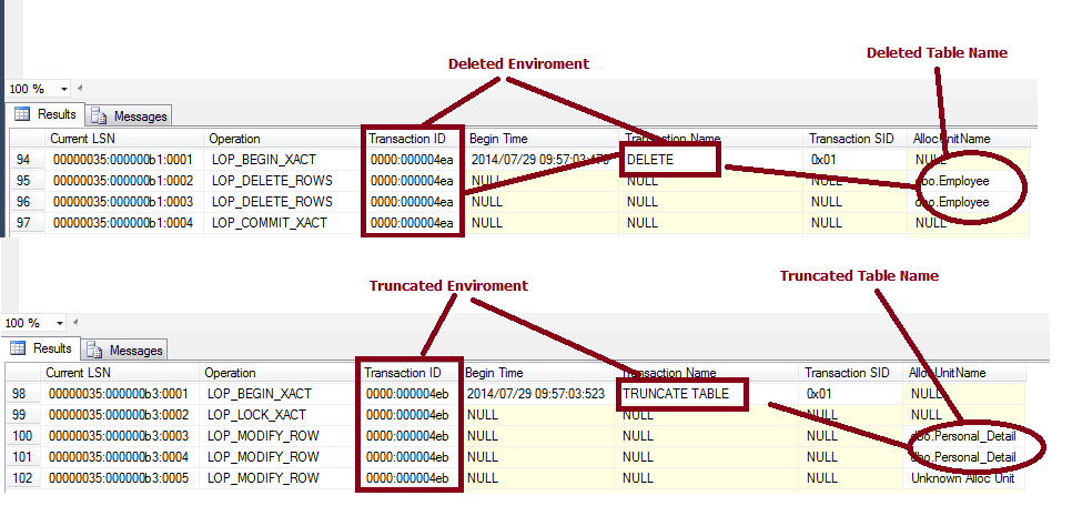 Now I will find the deleted and truncated rows using the Transaction log using the undocumented function "fn_dblog”. Run the code below to get information about all the deleted transactions.