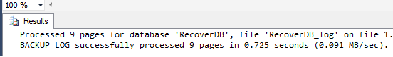 - BACKUP LOG RecoverDB TO DISK = 'D:\backup\RecoverDB.TRN'