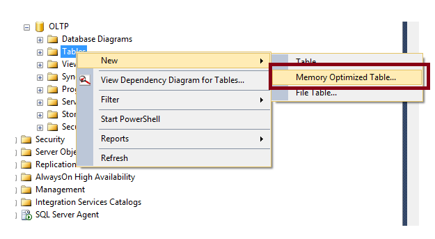 In the Object Explorer in SQL Server Management Studio click on the “Table” item and then hover over the “New” item that will display the “Memory Optimize Table…” option as displayed in the screenshot below: