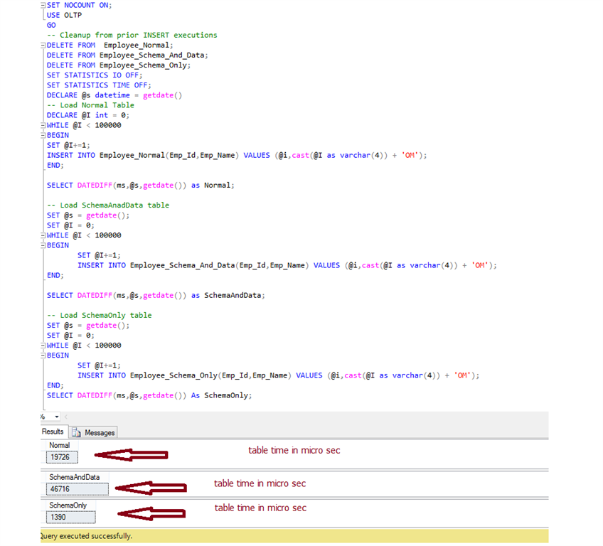 As you can see, I was able to load my “Employee_Normal” table faster than my “Employee_Schema_And_Data” table. I ran my script multiple of times and sometimes loading rows into the “Employee_Schema_And_Data” table outperformed loading rows into my “Employee_Normal” table. But when it did outperform, it didn't do it by very much. Additionally you can see that inserting rows into my “Employee_Schema_Only” table outperformed the loading of data into the other two tables. No matter how many times I ran this script, the loading of the table that had a DURABILITY setting of SCHEMA_ONLY always out performed loading into the other two tables.