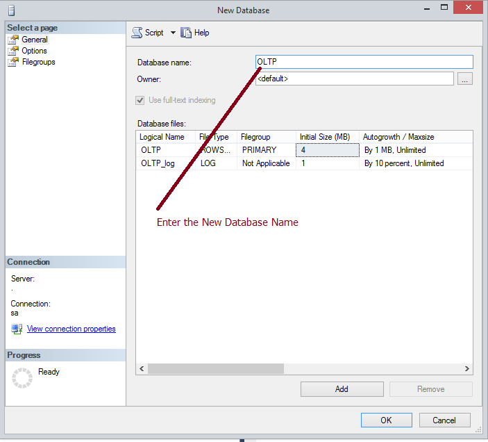 To create a database using SQL Server Management Studio I first right-click on the “Database” node, then select the “New Database” option from the menu. Doing this brings up the “New Database” window. In that window I identify the name of my OLTP database, so the window looks as in the following: