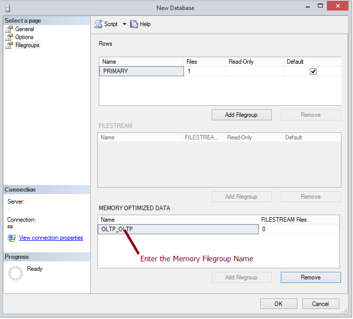 Then click on the “Filegroups” option in the left pane of this window. That brings up the filegroup window of the New Database dialog. In the filegroup window I click on the new “Add Filegroup” button under the “MEMORY_OPTIMIZE DATA” section of the right pane and then I enter the name of my new memory-optimized filegroup as shown in the screen shot below: