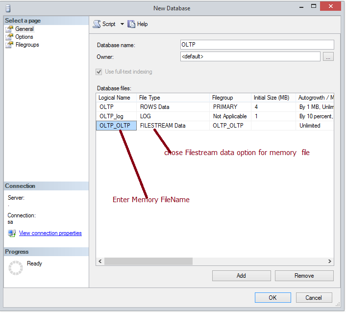 I then click on the “General” option in the left pane to add a new file in my new OLTP_OLTP filegroup. I do that by clicking on the “Add” button, then selecting a “File Type” of “FILESTREAM”, and then specifying the “Logical Name” of “OLTP_OLTP “ as shown in the screenshot below: