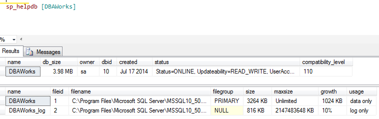 Now I am creating a Filegroup backup. First I will specify the logical filename within the database that can be obtained with the command sp_helpdb [DBAWorks]