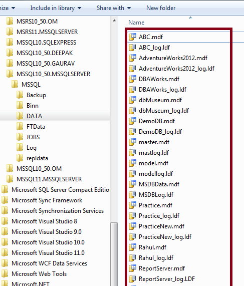A database is a collection of data sets, SQL Server database consists of at least two physical files on the hard drive, an MDF file and an LDF file. The MDF file contains all of the real data. The LDF file, or Log file, contains change records for ecah data. By default, both the MDF and LDF files are located in the SQL Server, as in the following screen.