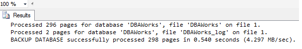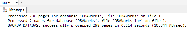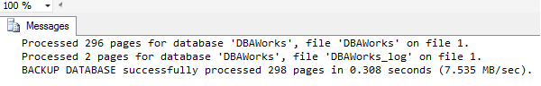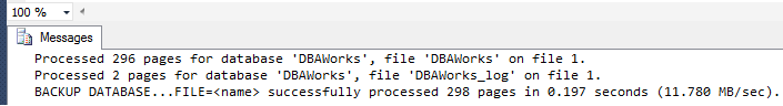 - BACKUP DATABASE [DBAWorks] FILE= 'DBAWorks'