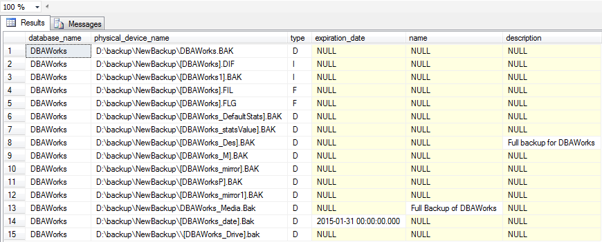 - TO DISK = 'D:\backup\NewBackup\[DBAWorks_date].Bak'