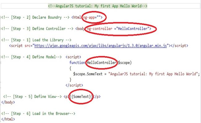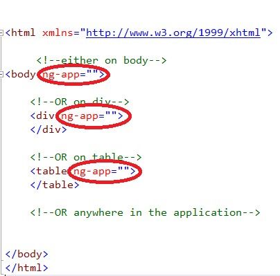 As you can see in above snapshot there are some circle areas. And I even mentioned steps which tell step by step what are our requirements to create an AngularJS application, Hope it would be running fast in your mind what are these. So let’s quickly move ahead ng-app = The ng-app directives initialize the AngularJS application. We can use it anywhere in the whole application where we want to see angular effect. We used it inside <html> element, which means AngularJS effect will be apply on whole application. If you want to use ng-app somewhere inside body or in particular <div> or on particular <table> then we can use this directive there, as you can see in below snapshot.